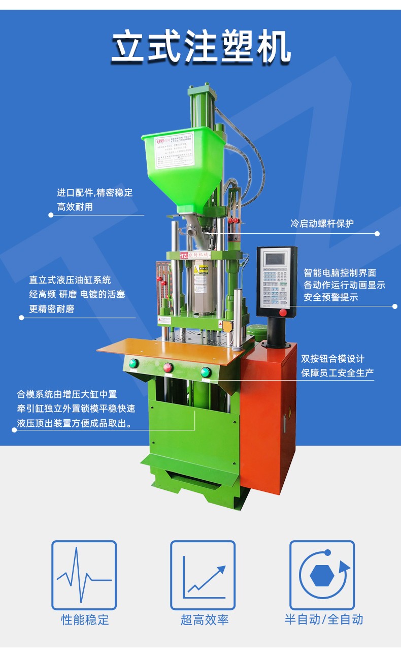 特(te)性: 1.立式合模,立(lì)式射出,低壓關(guan)模裝置,保護模(mó)具和人身安全(quán)。 2.三段溫度控制(zhi),射速,背壓,螺杆(gan)轉速無極調整(zhěng),适合各種精密(mi)😍塑膠件成型。 3.料(liao)管可升降,清料(liào)頭方便,固定模(mó)具更容易。