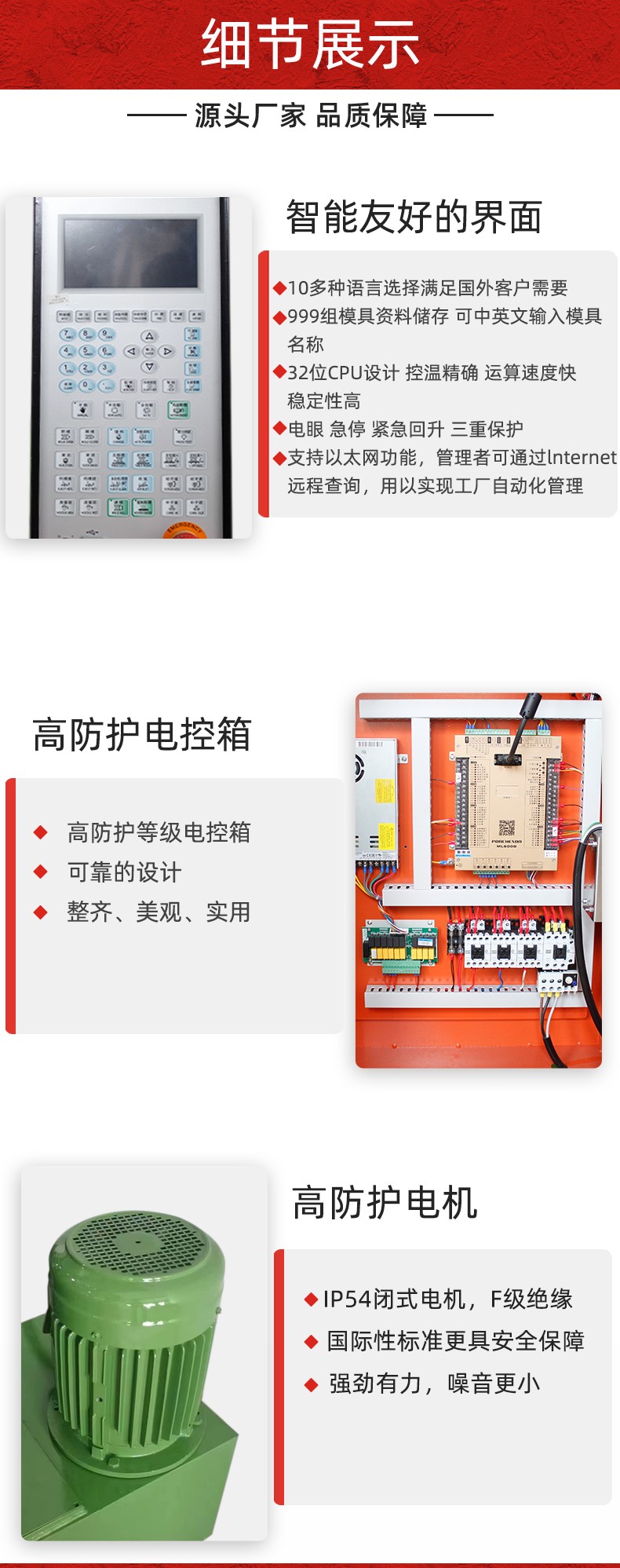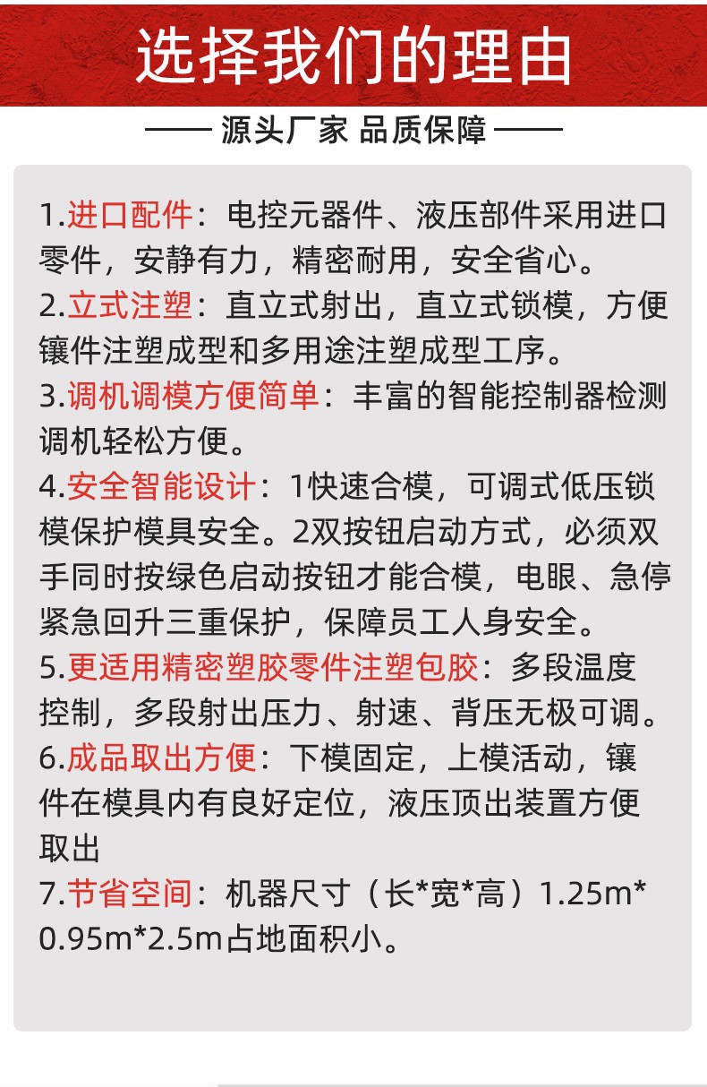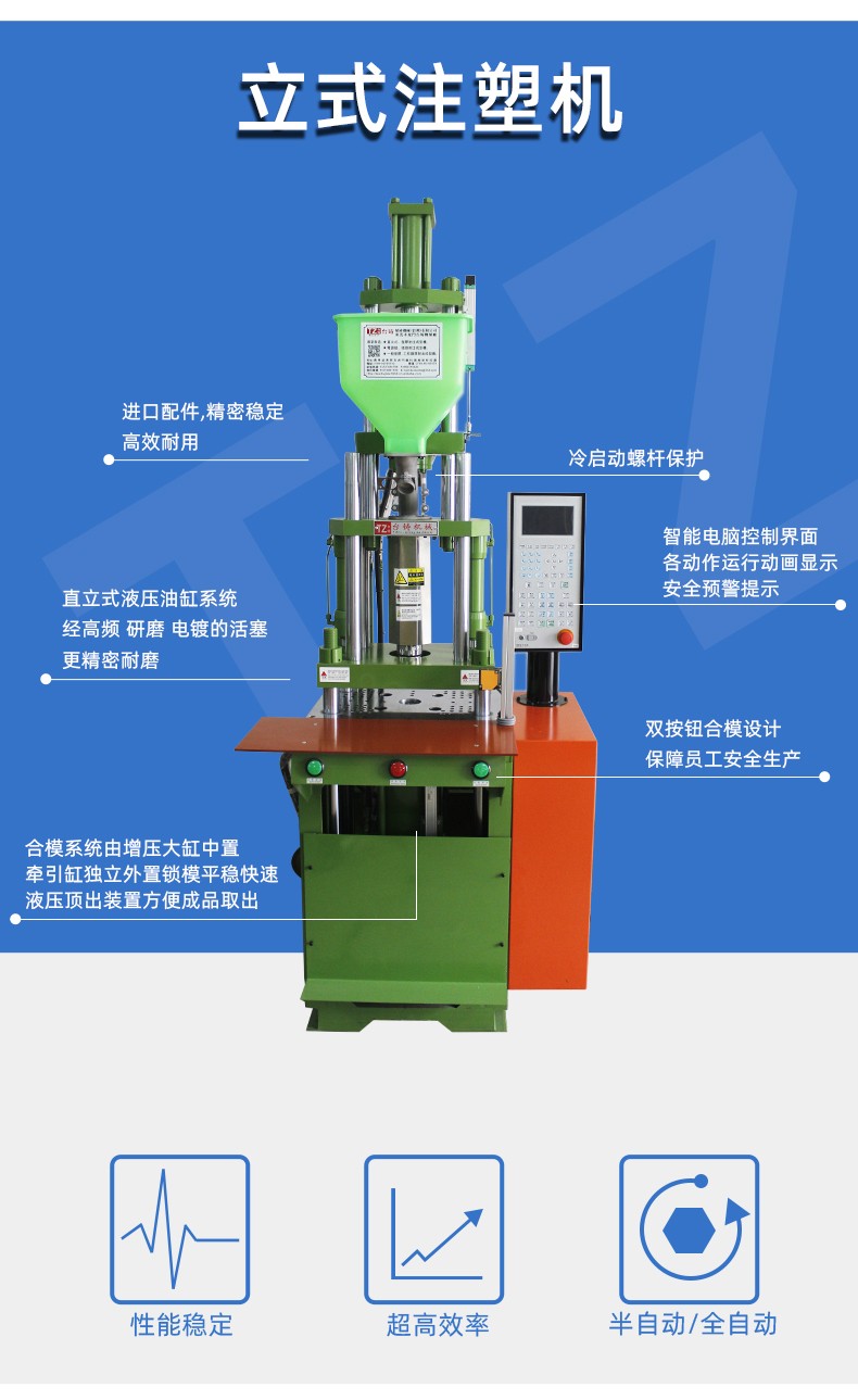 特(tè)性: 1.高速鎖模,低(dī)壓慢速合模。 2.全(quán)電腦比壓比流(liú),位置尺控制,操(cao)作方便準确,射(she)出采用雙缸平(píng)衡式射出系統(tong),平穩有力。 3.更适(shi)用于各種特殊(shū)工程塑料成型(xíng)。 4.合模系統采用(yong)增壓大缸中置(zhì),牽引缸獨立外(wài)置,鎖模平穩快(kuài)速。 5.可加裝單雙(shuāng)滑闆操作更方(fang)便,安全性更高(gāo)。